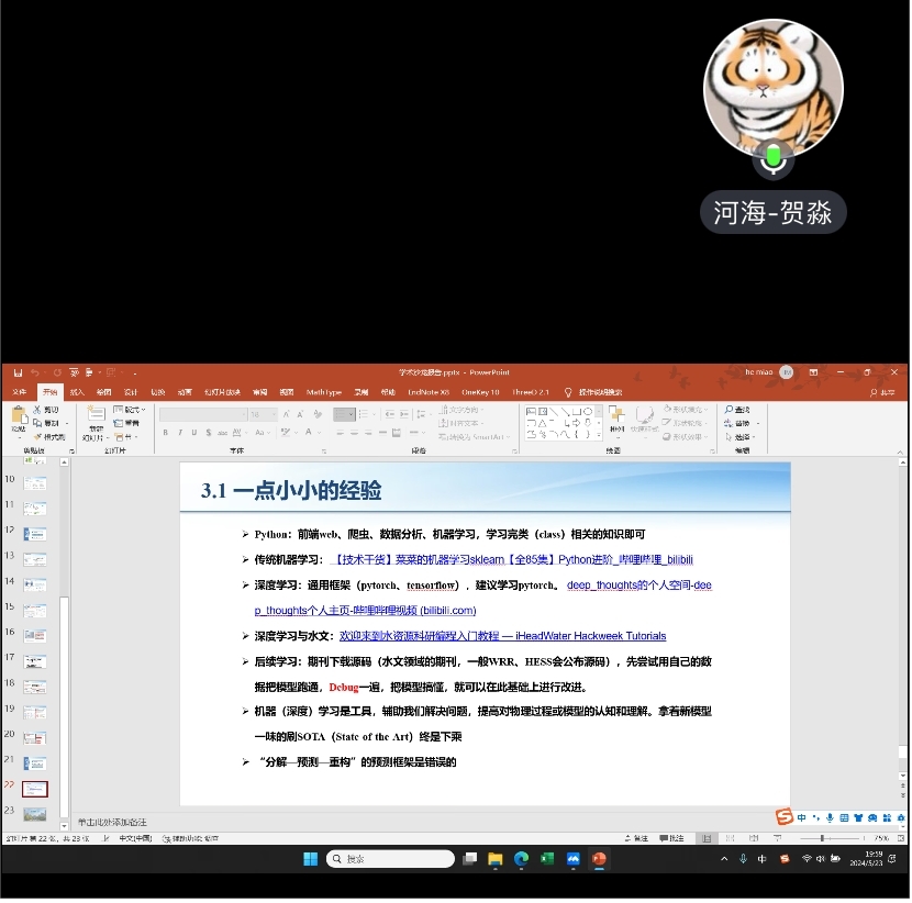 贺淼同学向大家介绍了水文模型与LSTM神经网络模型,并从模型区域化研究、模型可解释性、模型耦合和前沿方向等方面,结合图表,分享了自己的学习心得和经验。