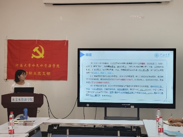20级生态水利专业研究生党员赵梓屹做了《长江江苏段浮游植物和着生藻类群落结构特征及环境因子变化研究》的学术报告,介绍了长江江苏段的水质时空变化规律,分析了长江江苏段浮游植物和着生藻类的群落结构特征,以及影响浮游植物、着生藻类群落演替的水环境因子,提出了在阐释机理的方法选用中存在的主要问题。20级人文地理学专业研究生党员王振康做了《中国沿海地区台风灾害综合风险评估与区划分析》的学术报告,介绍了我国沿海地区台风灾害评估指标体系及综合风险评估方法,提出了我国沿海地区台风灾害风险区划,为我国沿海地区应对台风灾害提出了对策建议。师生围绕台风灾害风险评估、河流健康评价、水生生物群落演替机理等开展交流讨论。