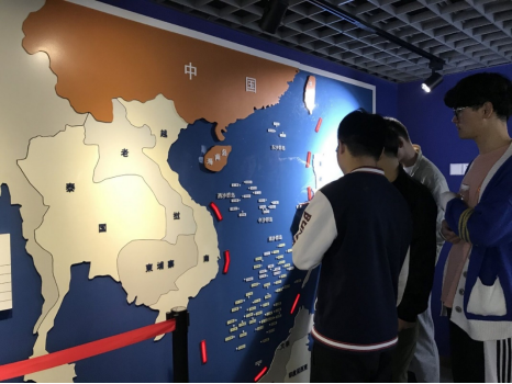 在宁海路街道海洋国防教育馆,一张张地图是地图学与地理信息系统专业同学们讨论的焦点。从内陆的出海口,到近海十二海里的中国领海线,再到远海的第一岛链、第二岛链、第三岛链。一张张形象生动、内容丰富的地图不仅承载着基础地理信息,还是我国走向深蓝的体现,更是中国共产党领导中华民族走向伟大复兴的历史见证。