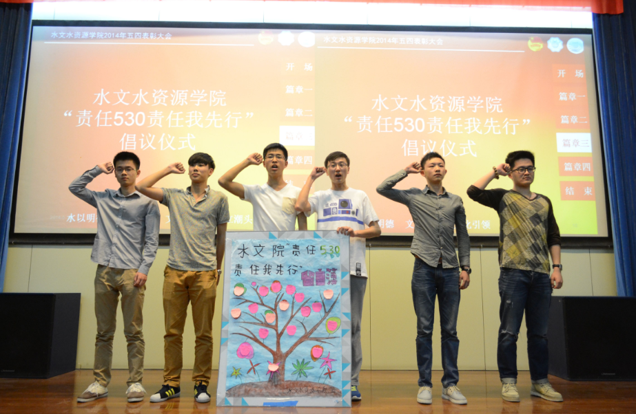 水文院五四青年科技奖获得者杨传国老师发表感言,感谢学院领导的栽培与支持,鼓励青年学生参与科研,珍惜时光。优秀学生代表10级朱非林分享他的励志故事,感谢自己成长路上的引路人,告诫学弟学妹努力学习,成长成才。随后13级宋耘同学宣读吃瓜网 “责任530,责任我先行”倡议书,13级学生代表上台宣誓。最后大会在欢快悦耳的合唱中结束。