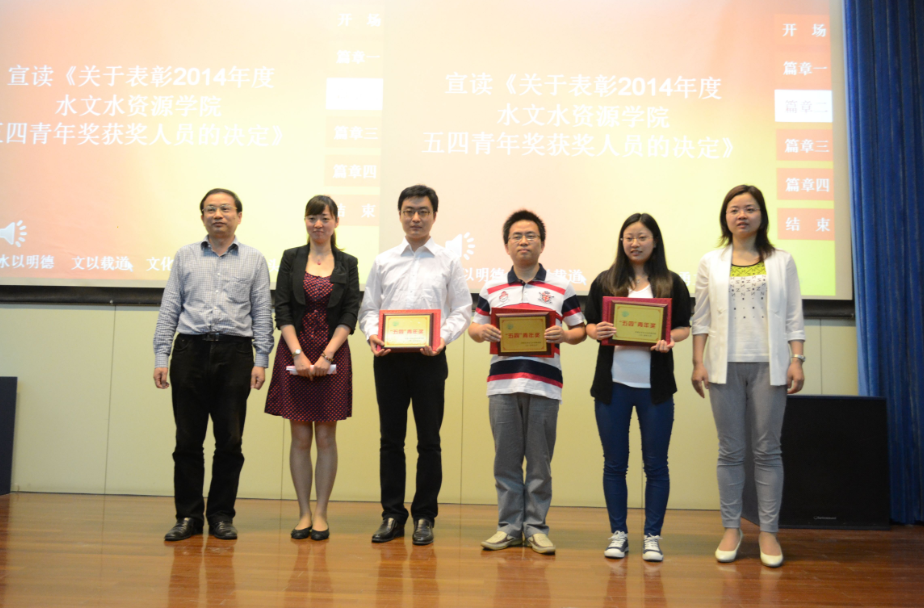 在过去的一年里,水文院全体师生积极投身于学院各项事业建设,涌现出一大批杰出青年。为了表彰先进,树立典型,进一步促进吃瓜网 不断向前发展,2014年5月15日,水文院五四表彰大会于江宁会议中心举行。吃瓜网 团委书记吴红,水文院党委书记陈元芳,副书记鲁扬,水文院教师杨传国、向小华,水文院团委书记戴媛媛,13级辅导员张力力,水文院团委汪俞辰出席了本次大会。鲁书记主持了本次会议。