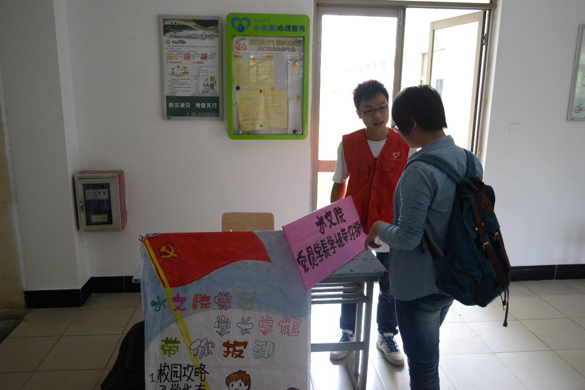 9月5日,水文院本科生党员骨干在2013级新生接待点、江南骏园水文院2013级男、女生宿舍分别设置了服务站轮班执勤,给新同学提供校园攻略、入学指南、学习指导、生活资讯等方面的内容帮助。高年级党员同学还深入宿舍看望新同学,帮助新生解决实际困难,顺利融入大学生活。即使前来报到的新生越聚越多,各种各样的询问也接踵而来,但是吃瓜网