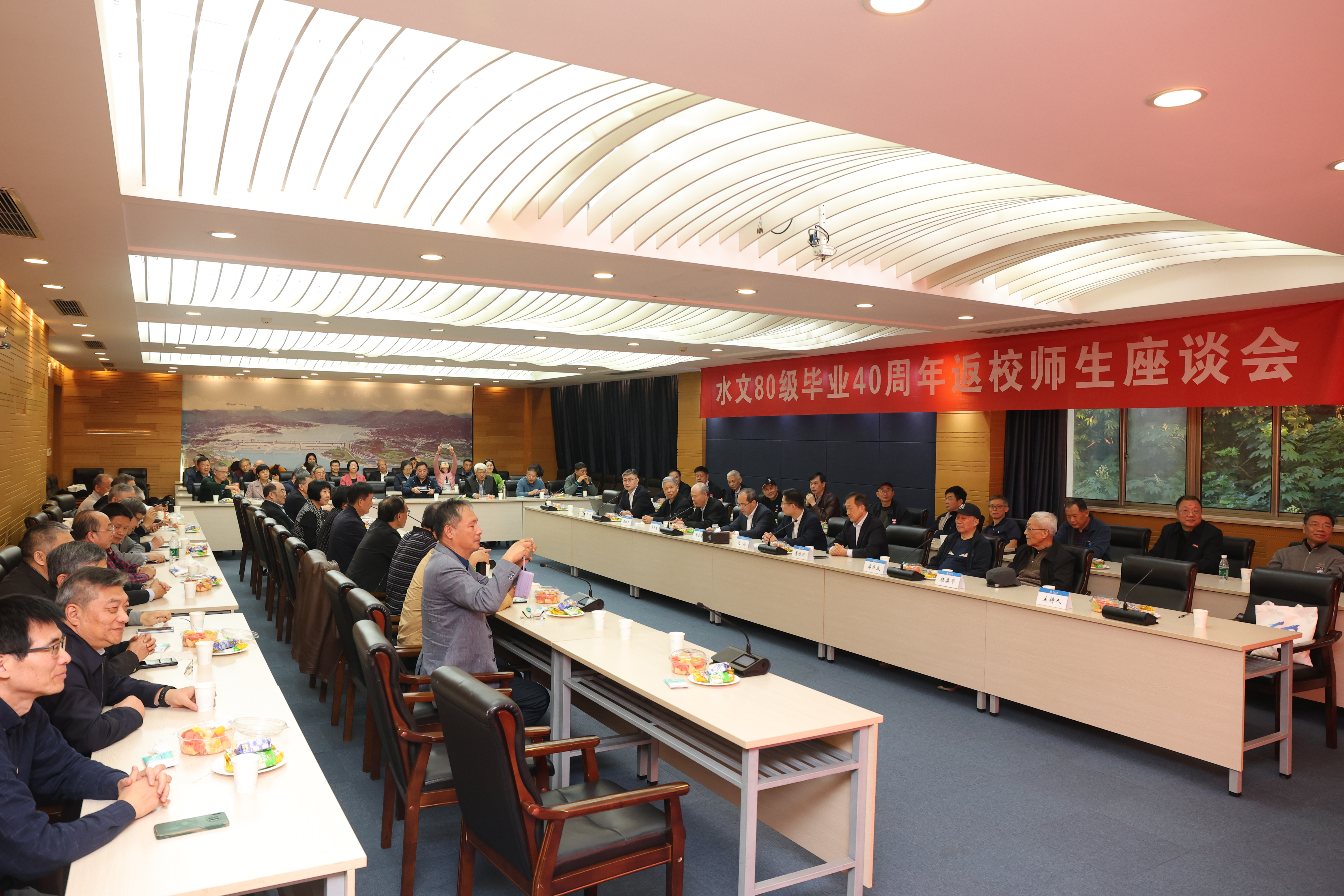 参观过后,在闻天馆203举行了师生座谈会,校长郑金海教授,原校长张长宽教授,副校长沈扬教授、原副校长董增川教授,水文院党委书记石朋教授,任课教师黄振平教授、李杰友教授,辅导员杨奠华老师等参加座谈会。郑金海校长对各位校友返校表示热烈欢迎,对校友们长期以来支持和关心母校发展表示感谢,并热情邀请校友们参加明年110周年校庆活动。沈扬副校长向校友们详细介绍了学校在各方面取得的成就及进一步发展规划。曾任水文80级辅导员的张长宽老校长回顾了与同学们朝夕相处的美好时光,勉励大家平衡好工作、生活与健康的关系。79级学长董增川教授,深情回忆了80级校友对学校和他本人的支持,并高度评价了校友们在各自领域中的杰出贡献。黄振平教授回忆了当年给大家在北教上水文统计课的情景,高度赞扬了水文80级同学认真刻苦的学习风气。石朋书记介绍了学院在学科建设、教学、科研和队伍建设等方面的成就。校友代表们纷纷表达了对母校和老师们的感恩之情,为母校四十年来的蓬勃发展、辉煌成就感到自豪。座谈会由水文80级代表陈元芳主持。
