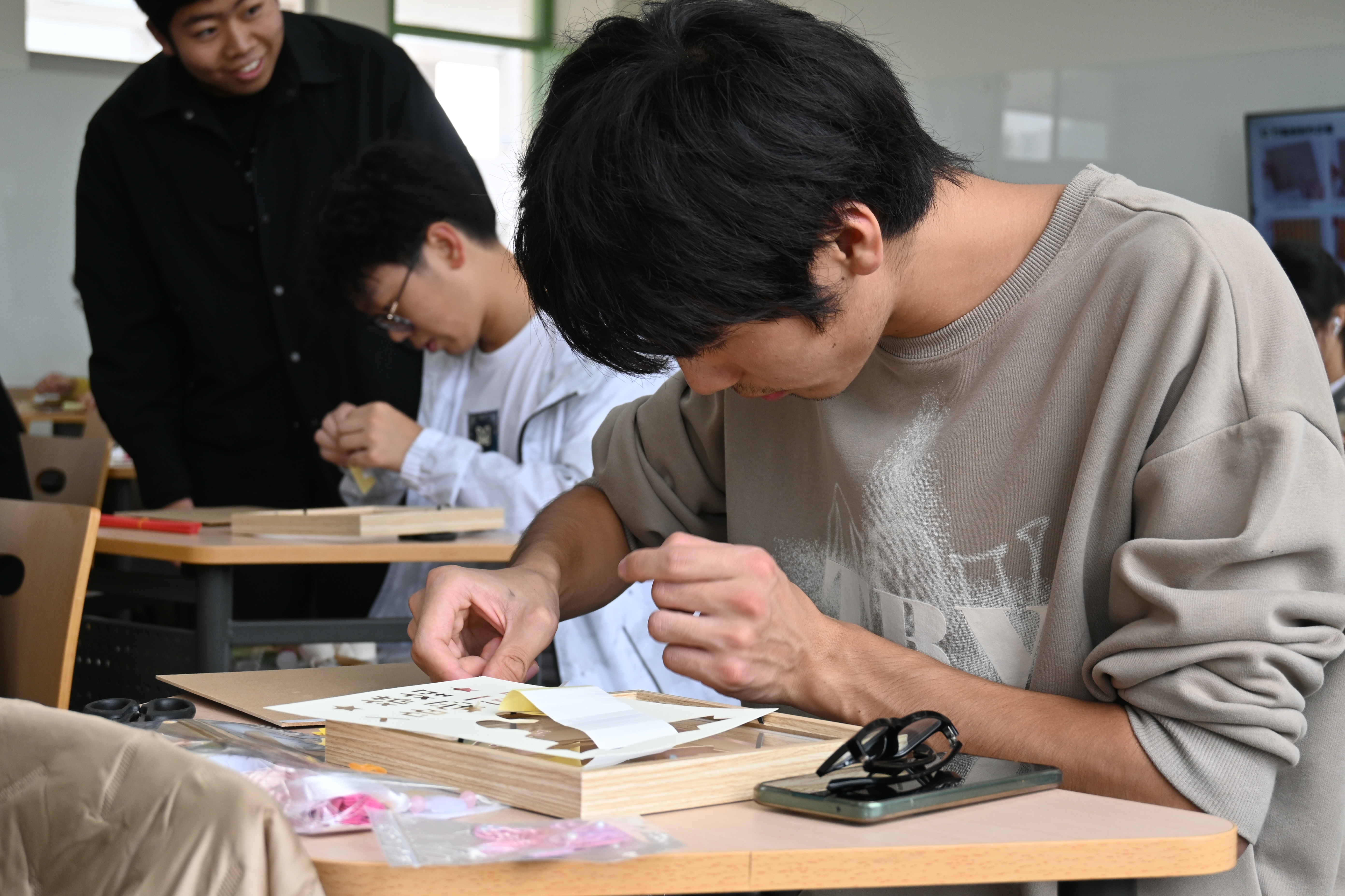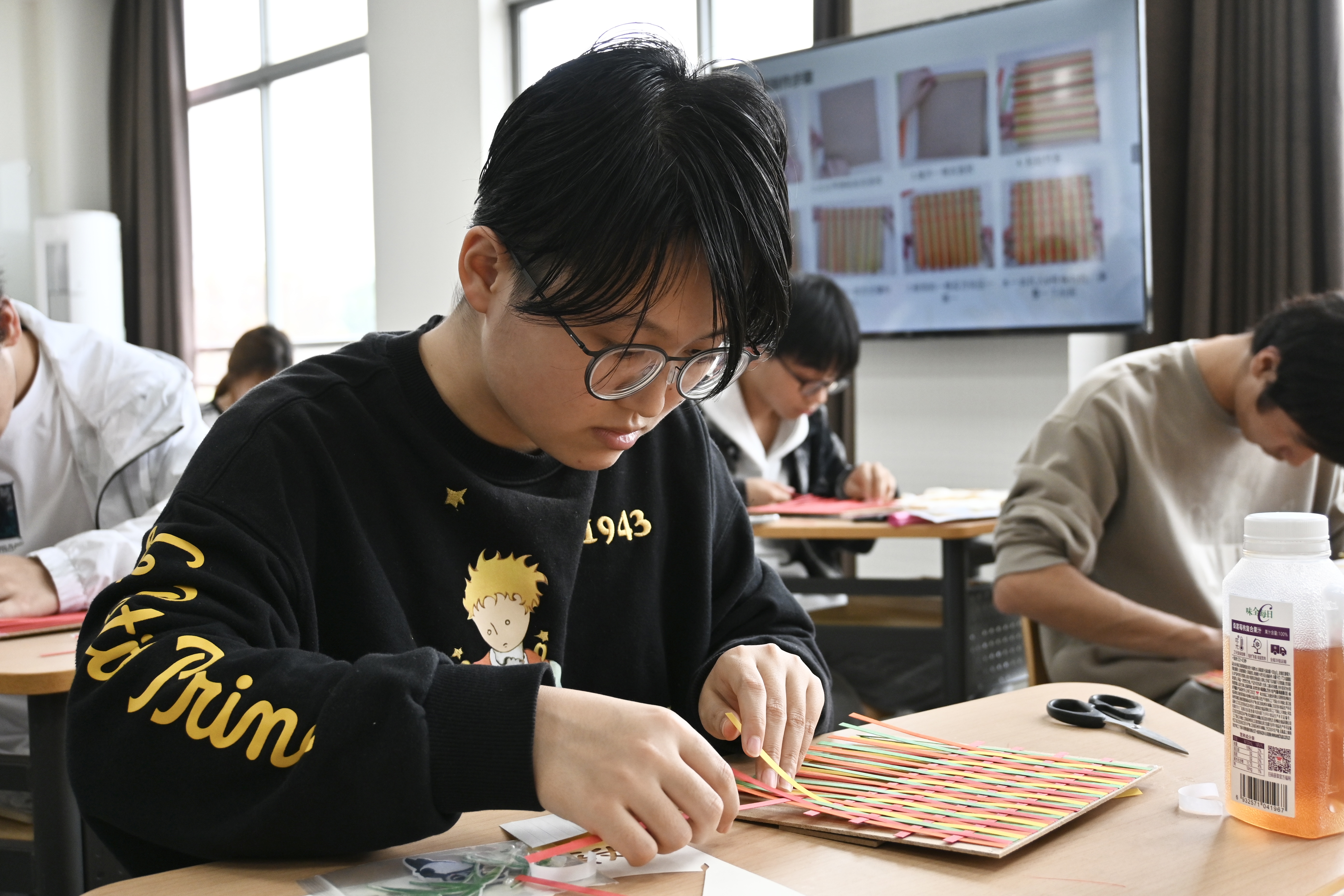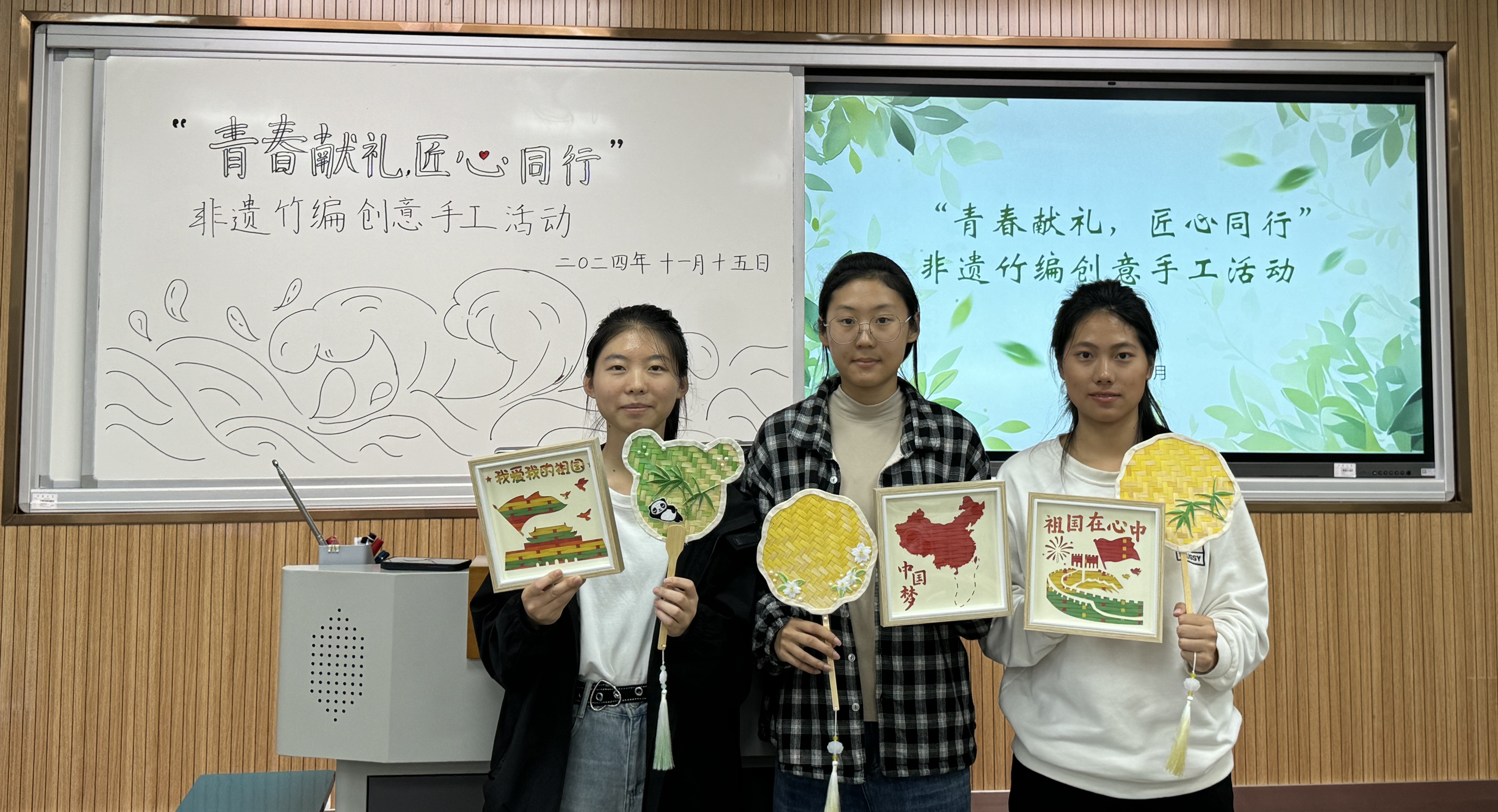 辅导员吴晓芬老师简要介绍了竹编的发展历史、制作流程及传承意义,说明了竹编过程中的注意事项,并呼吁同学们以制作竹编作品为契机表达对祖国繁荣富强的美好祝福。制作的过程中,同学们在老师的指导下以手造物,以物寄情,通过一上一下,一横一竖的编织方法,在挑、压、破、拼、提等手工编织技法下,将心中图景编织成了一幅幅饱含爱国爱党情怀的竹编画作品和一个个充满深厚文化底蕴的竹编扇作品。