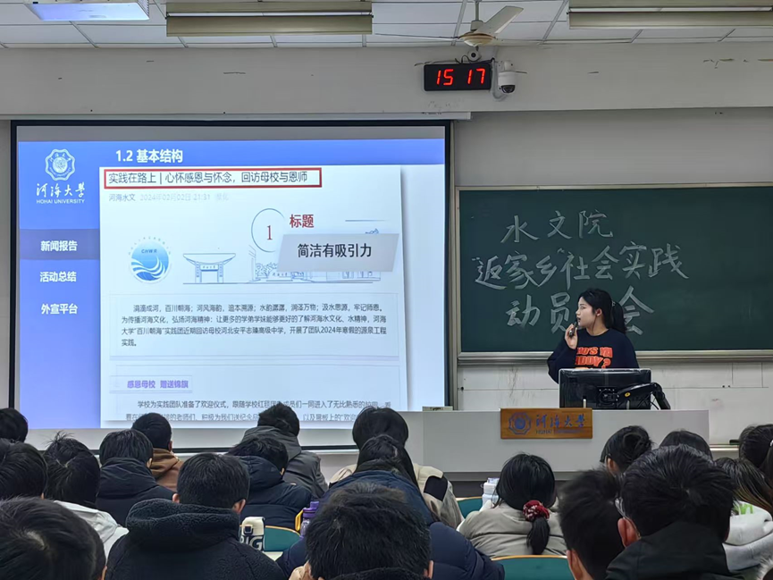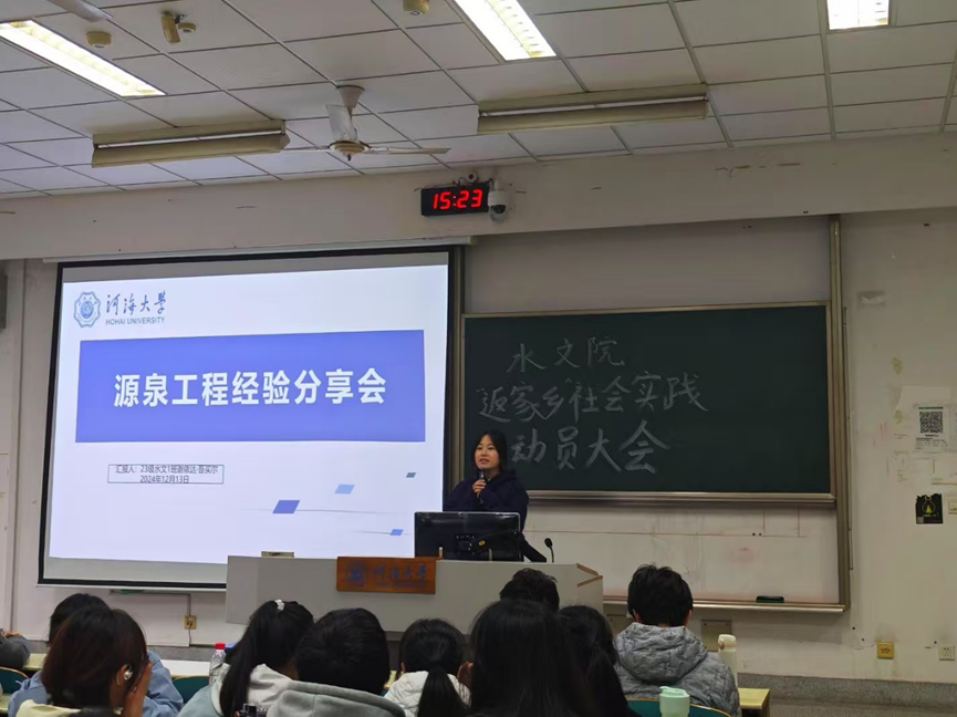 在寒假社会实践动员大会上,林老师向同学们详细介绍了“返家乡”社会实践的丰富内涵,其中,着重介绍了源泉工程,鼓励学生回到生源地,通过多种方式分享吃瓜网 的求学经历,传播河海文化,弘扬河海精神,提高学校在中学的影响力。接着林老师就源泉工程的实践流程和实践内容展开了详细介绍,为学生们提供了清晰的指导,并鼓励学生们积极参与社会实践的评奖评优,准备高质量的材料,展示丰富的实践成果。