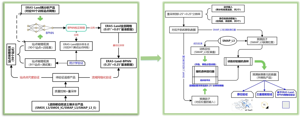 遥感土壤水分产品在像元尺度缺乏精度评估基准的问题,融合原位观测与陆面模式模拟数据,结合人工神经网络方法,构建了具备高空间连续性和时间连续性的高质量基准数据集,有效支撑了网格化土壤水分产品的精度评估与校验;针对现有遥感土壤水分优势产品(如SMAP_L3)存在的时空缺口问题,通过引入遥感实时降水和陆面模式地表温度模拟,辅以静态地表参数,构建了针对遥感土壤水分产品的低延迟缺口数据重建框架,有效提高了遥感土壤水分产品在数据缺测情景下的实时连续性。