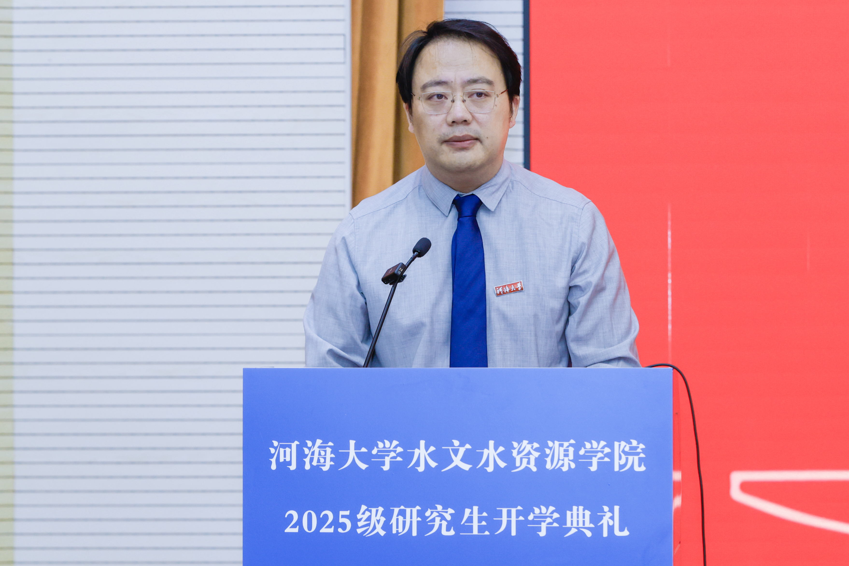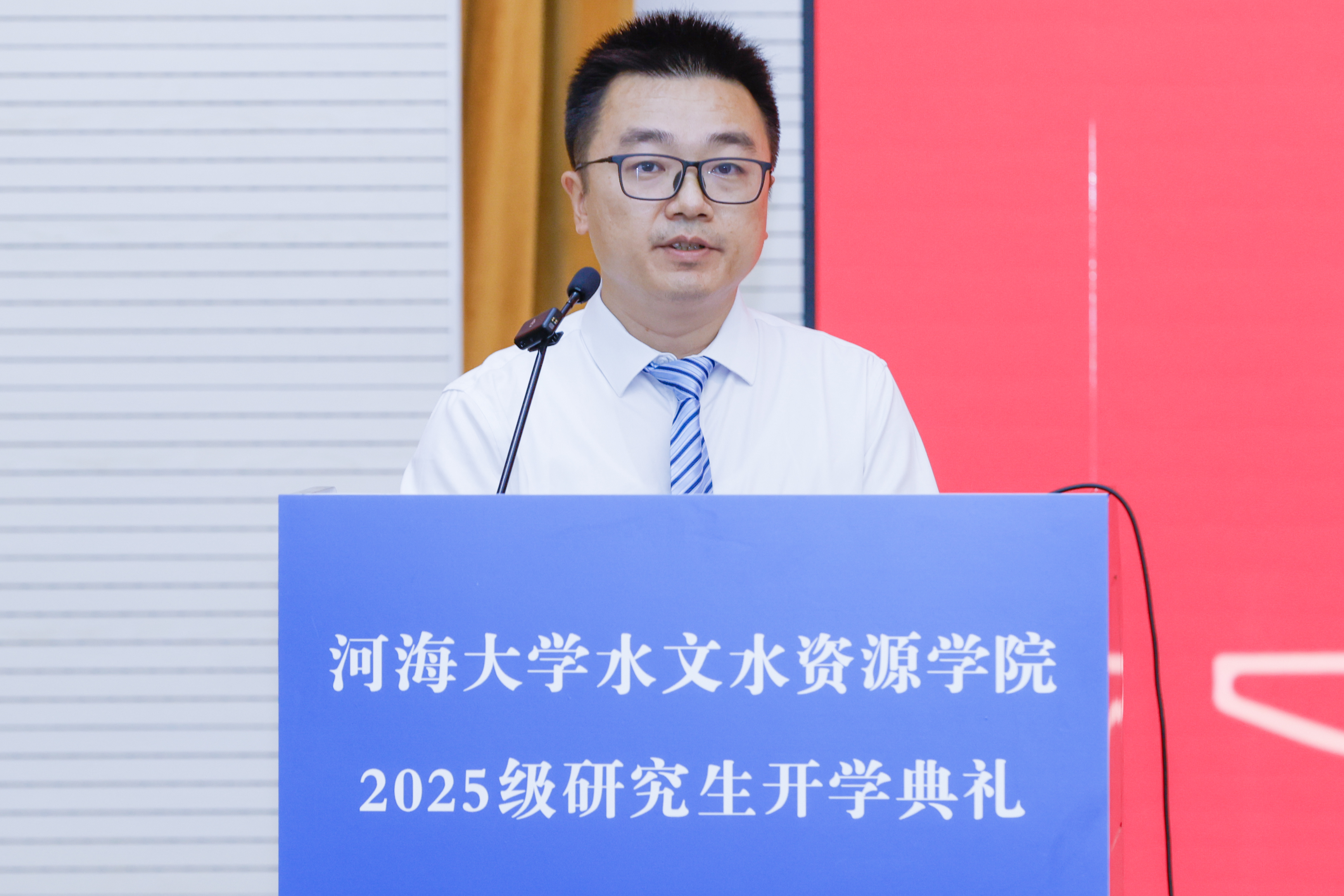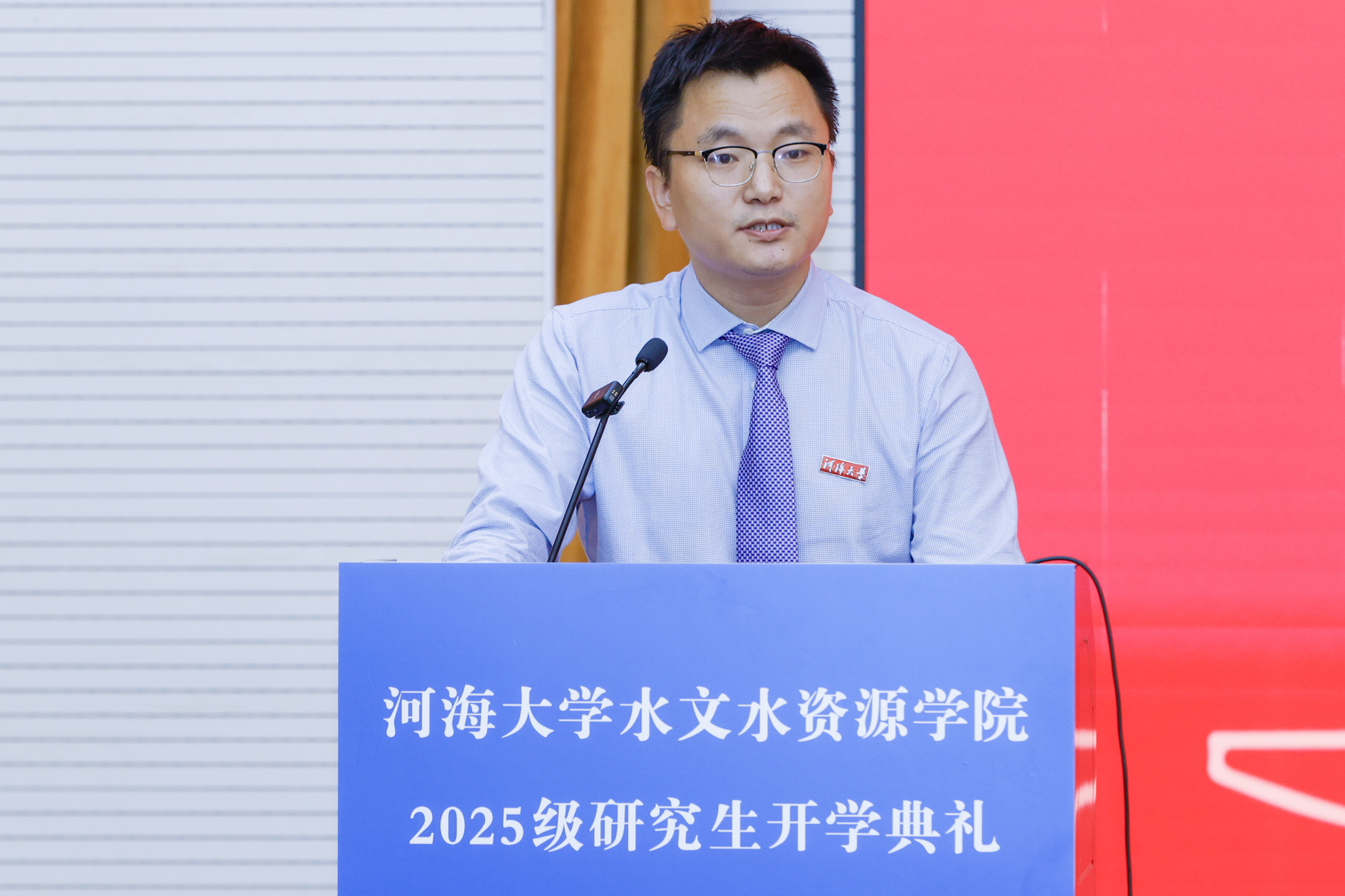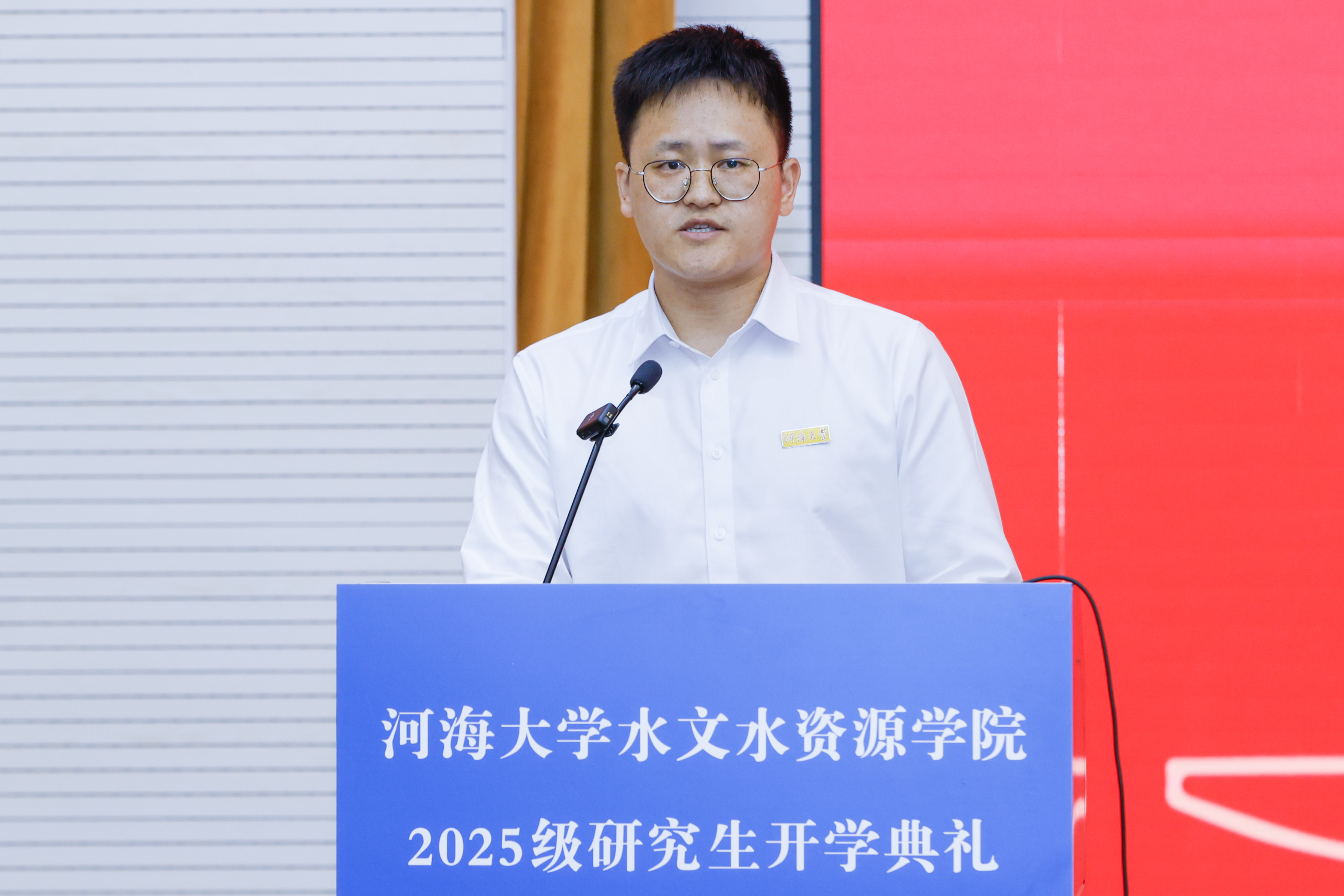 在校生代表、2022级博士研究生杜树平结合自身科研经历,从“锚定时代命题”“打破学科边界”“善用团队智慧”“把握张弛之度”四个方面分享体会,鼓励新生将论文写在祖国江河湖海之间,将个人理想融入国家发展的江河湖海,以奋斗青春践行水文使命。