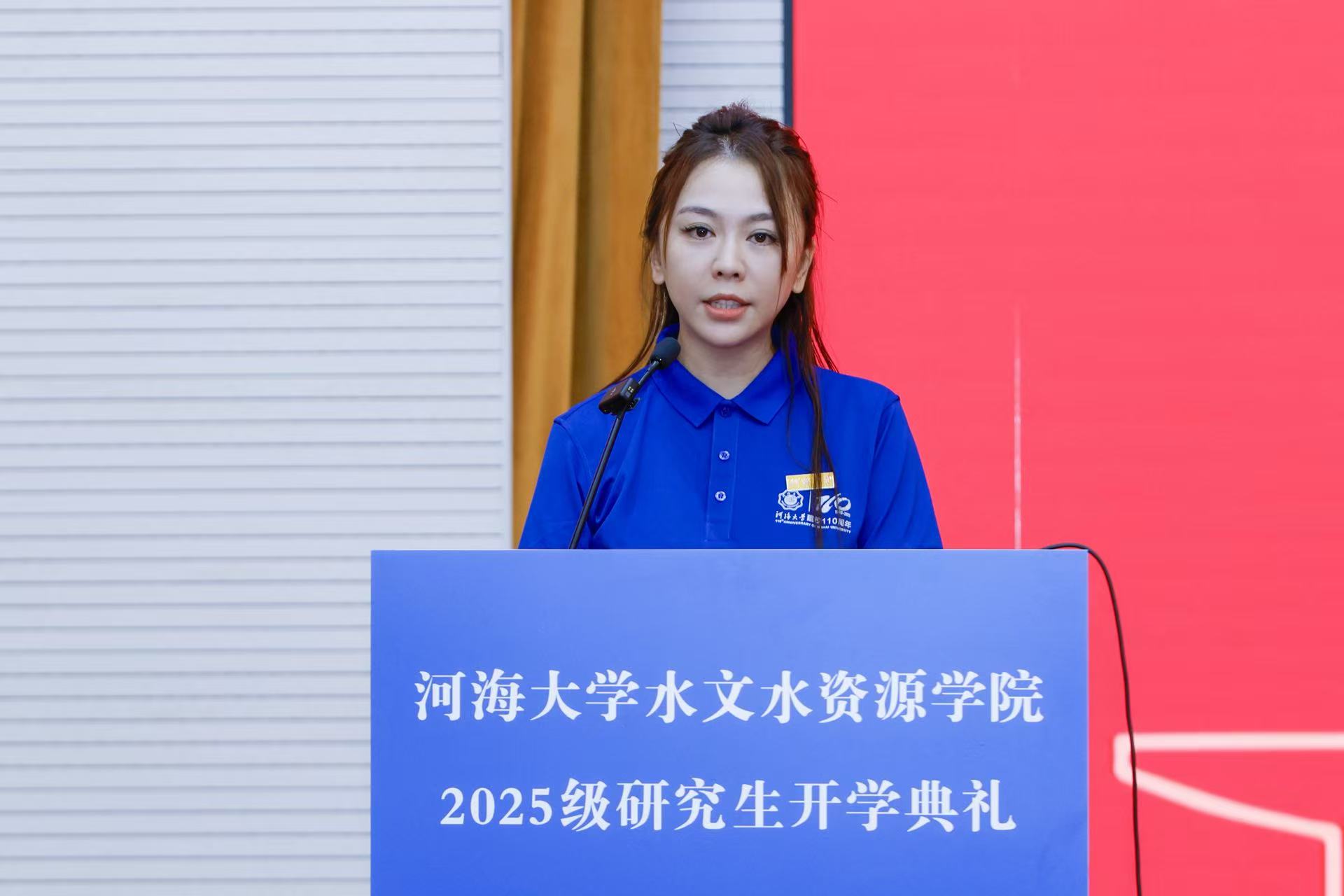 新生代表、2025级博士研究生常晓帝表达了对未来学习生涯的憧憬与决心。她表示将珍惜在河海学习的宝贵机会,扎根理论、勤于实践,立志在水环境治理、智慧水利等国家重大战略中贡献青春力量。