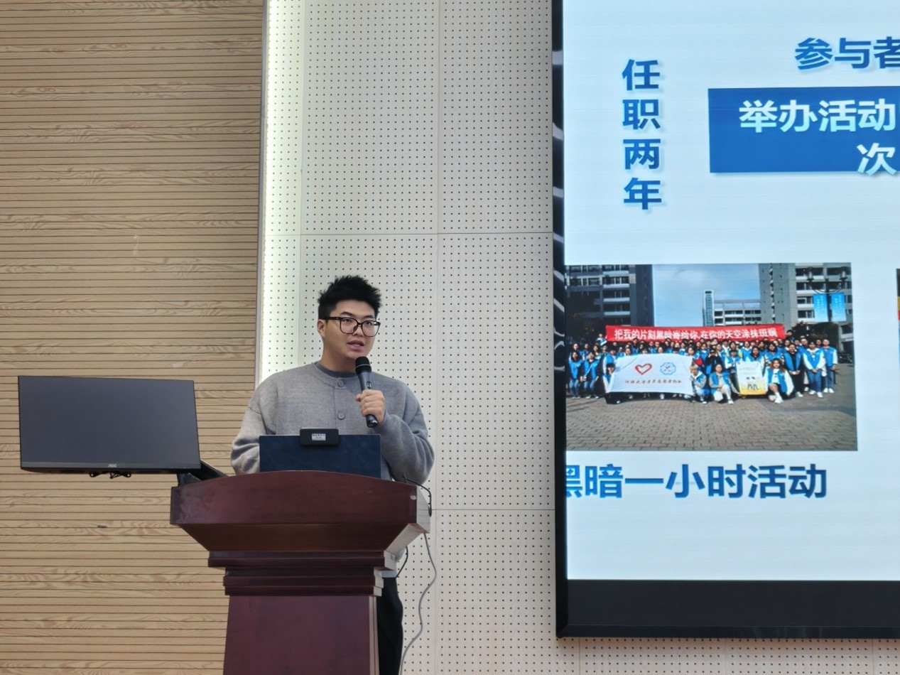 作为吃瓜网 “十佳志愿者”,孙悦洋以“立志达愿微光燃,青春践行温暖传”为主题,分享多维度志愿实践,鼓励新生结合特长践行志愿精神。他任溯源保护母亲河协会社长期间,带队巡河40次、里程超360公里,呼吁新生以“以水为媒”践行公益,在服务他人中找到青春的温度与重量。