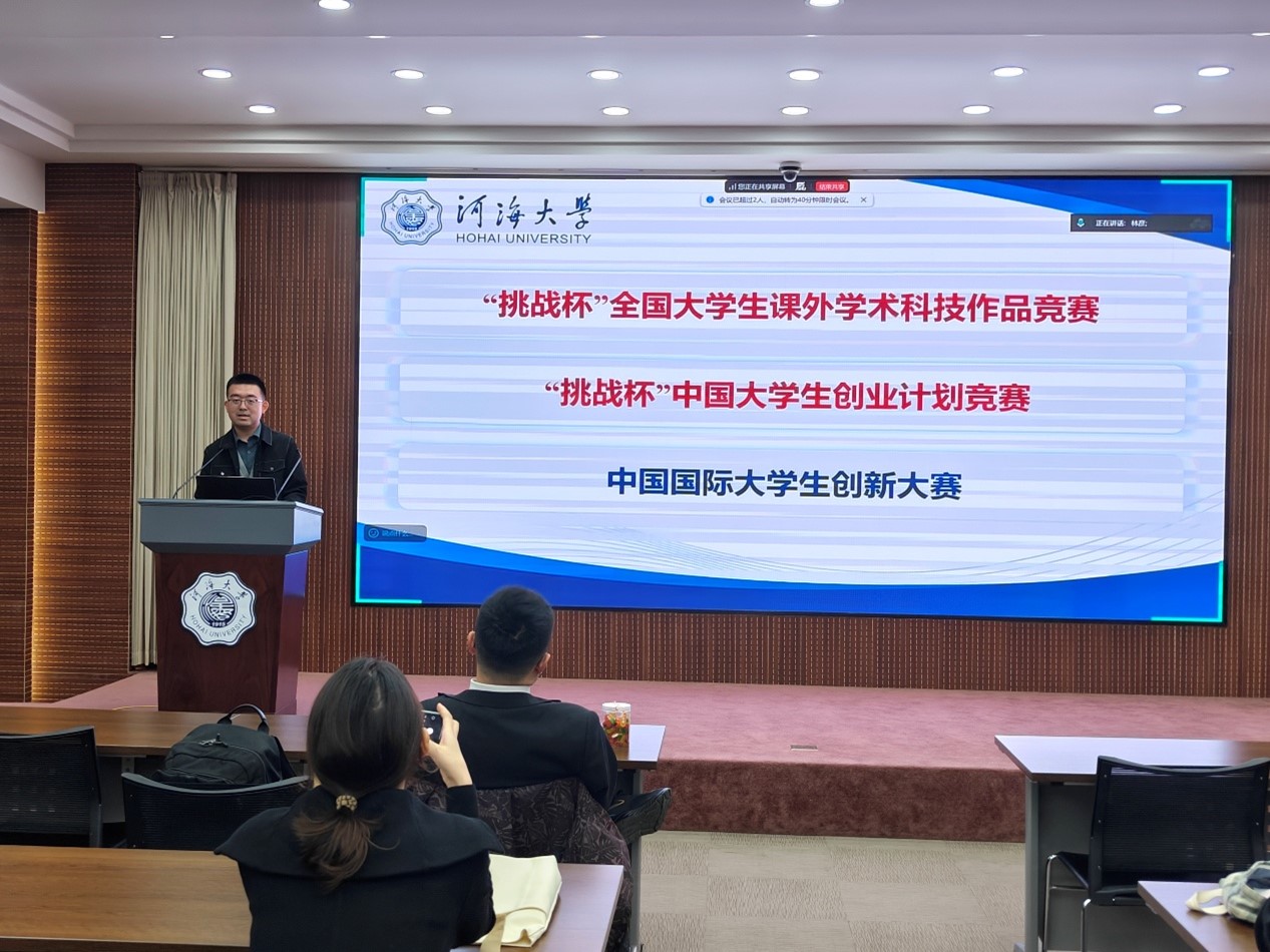 李昊从赛事认知入手,系统梳理了“国创赛”“挑战杯”等竞赛的政策导向、赛道设置、组队要求和评分标准。他指出,当前获奖项目普遍具备学科交叉与技术创新双重特征,尤其在人工智能、数字化、新能源等国家战略前沿领域表现突出。他鼓励同学们立足水文、水利等学校优势学科,拓展项目视野,提升综合竞争力。