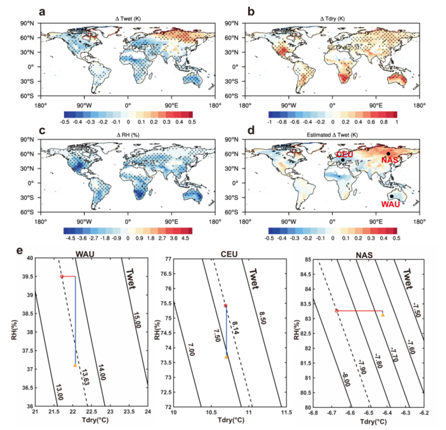 受气候变暖影响,极端天气事件日趋频发。其中,高温与高湿并存的湿热浪事件正对全球多个地区构成严峻挑战。这种温湿协同升高的组合会显著削弱人体体温调节能力,大幅增加户外工作者罹患热病乃至死亡的风险,对人类健康的威胁远超仅以高温异常为特征的干热浪。尽管科学界已经逐步认识到陆气相互作用在调节极端高温过程的关键作用,但湿热浪所受关注仍明显不足。针对上述不足,吃瓜网 袁山水教授团队与南京信息工程大学、加州大学洛杉矶分校合作,开展了有无陆气耦合情景的气候对比实验以及偏微分方程分析,揭示了土壤湿度-大气反馈对干、湿热浪的差异化影响机制,并从“增温”与“减湿”相互竞争的角度阐明了全球湿热浪响应的区域化差异(图1)。